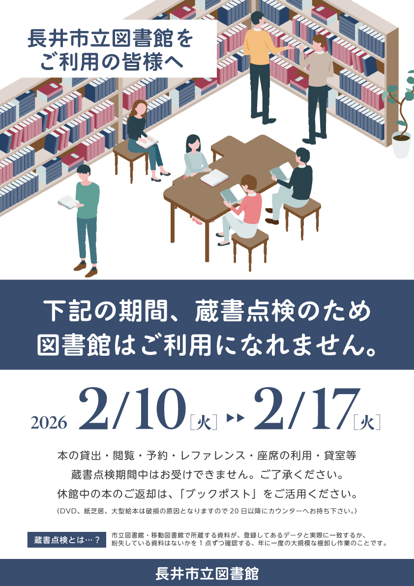 本の貸出・閲覧・予約・レファレンス・座席の利用・貸室等、蔵書点検期間中はお受けできません。ご了承ください。